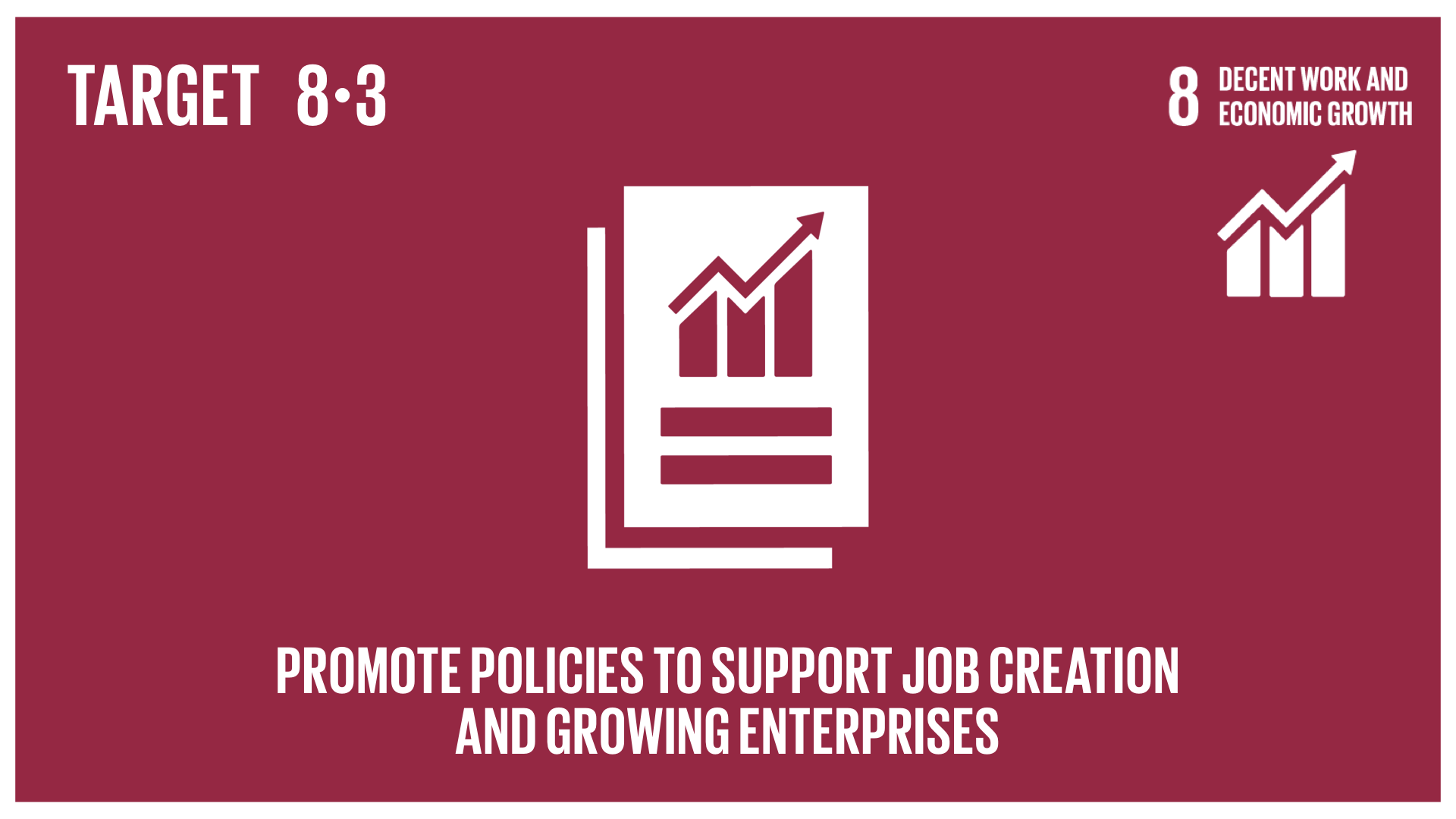 8.3 Bevorderen van op ontwikkeling toegespitste beleidslijnen die productieve activiteiten ondersteunen, alsook de creatie van waardige jobs, ondernemerschap, creativiteit en innovatie, en de formalisering en de groei aanmoedigen van micro-, kleine en middelgrote ondernemingen, ook via toegang tot financiële diensten.