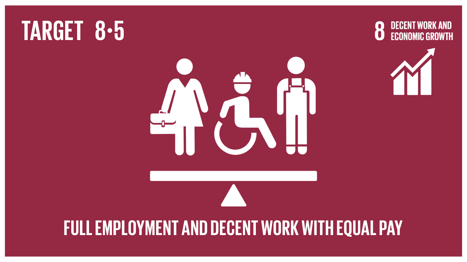 8.5 Tegen 2030 komen tot een volledige en productieve tewerkstelling en waardig werk voor alle vrouwen en mannen, ook voor jonge mensen en personen met een handicap, alsook een gelijk loon voor werk van gelijke waarde.