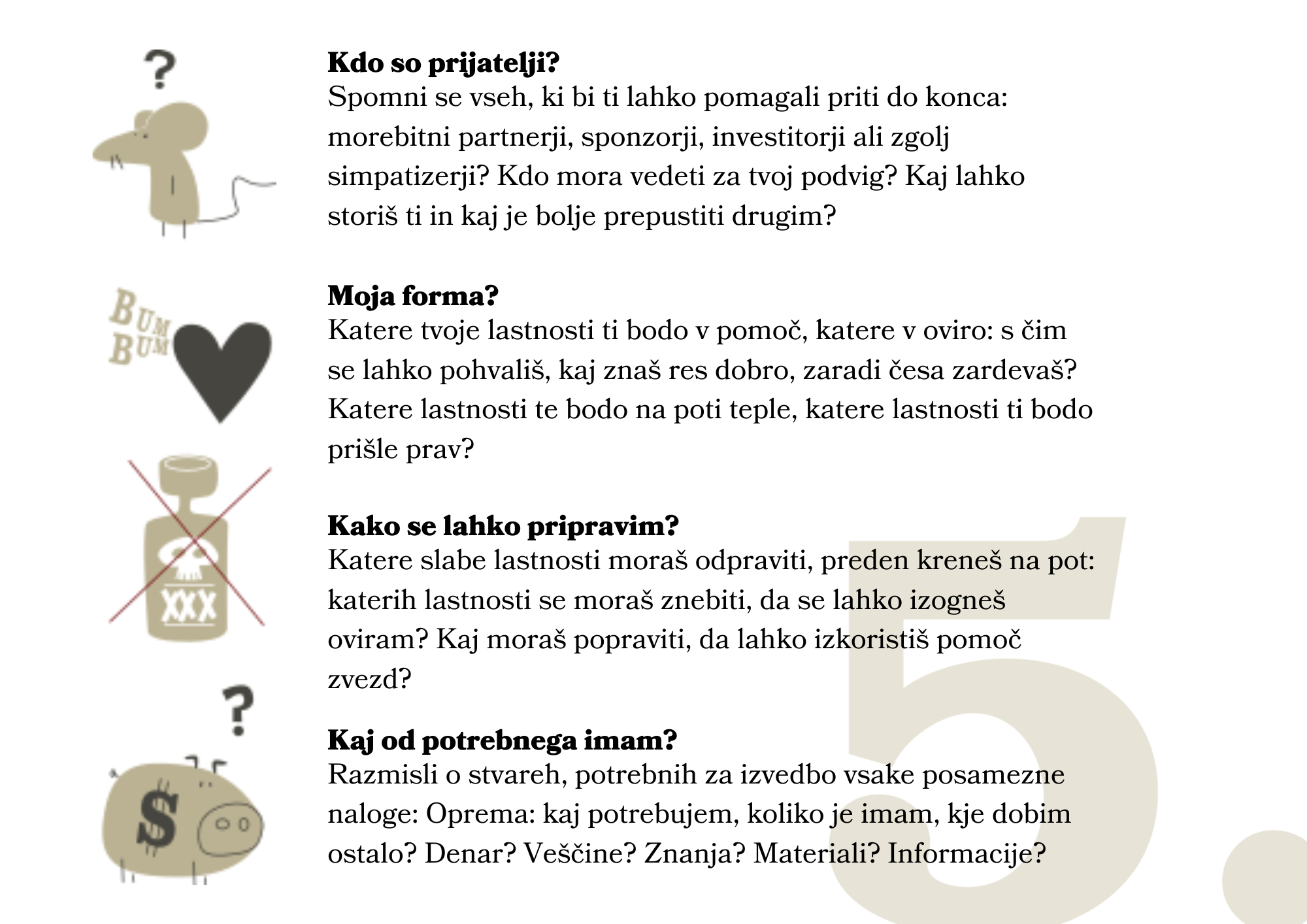 Poglejmo smernice in preverimo, kako se te nanašajo na tvojo idejo in njeno uresničitev. Naredi zapiske za vsako točko: