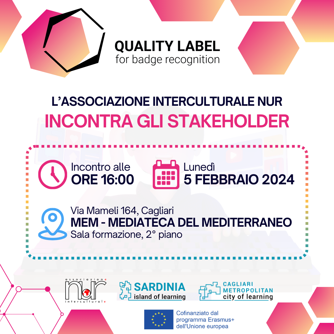 Il possessore di questo badge ha partecipato all'incontro con stakeholder organizzato dall'Associazione Interculturale NUR a Cagliari, lunedì 5 febbraio 2024 alle ore 16:00, per presentare e ricevere feedback su:
